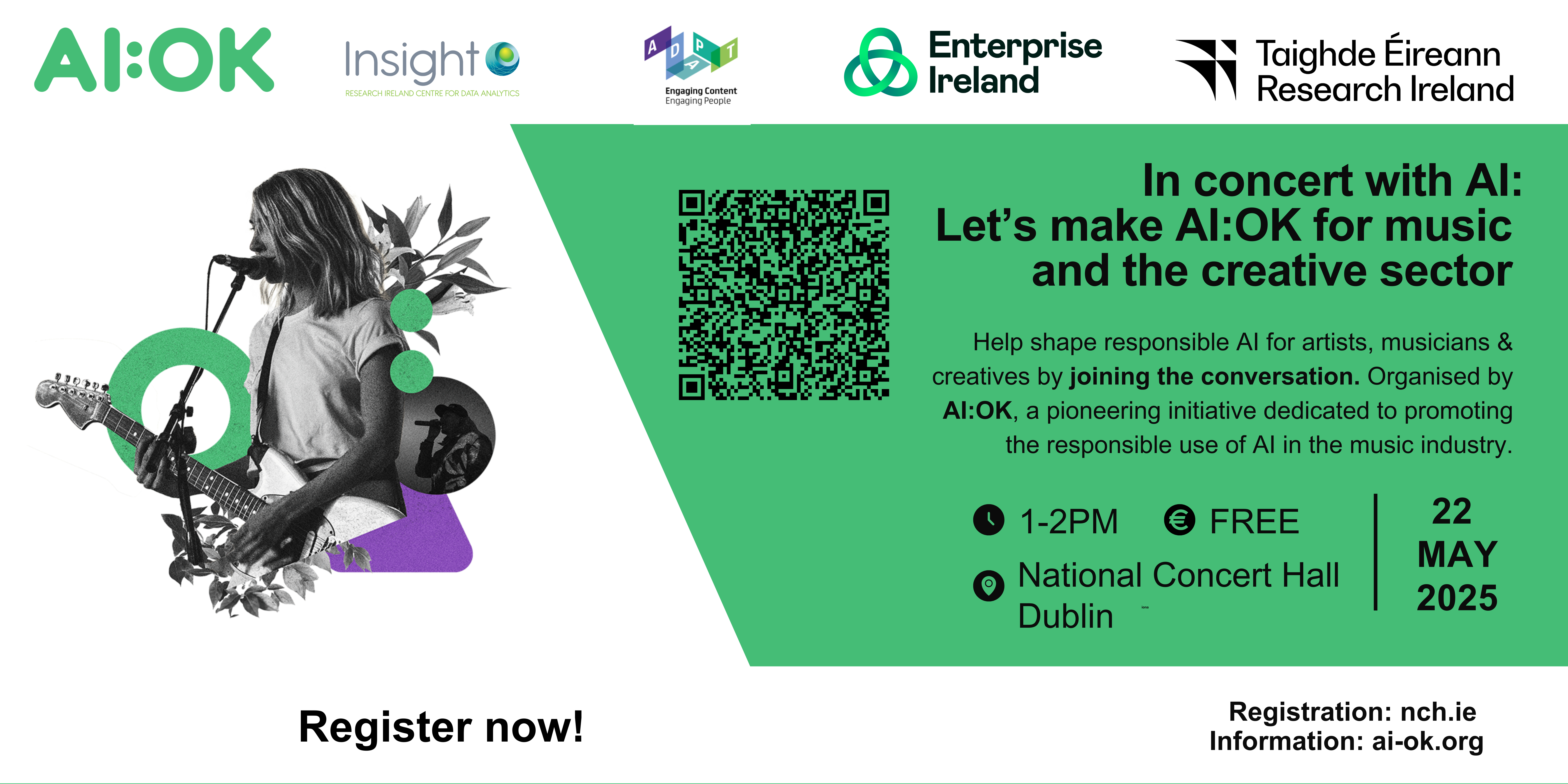 Join us at Dublin’s National Concert Hall on May 22, 2025, for a free event discussing the impact of AI on music and creativity. This is an exploration and a call to action, highlighting both the threats and potential of AI within Ireland’s creative sectors. “Let’s make AI:OK for music and the creative sector” unites influential voices in AI, music, policy and ethics to chart a responsible path for AI integration.